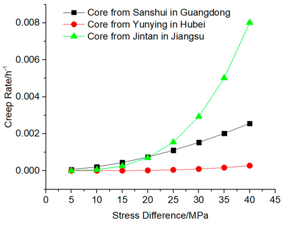By fitting the steady-state creep rate of salt rock samples under 30 MPa confining pressure in Sanshui Basin with the Norton steady-state creep model (as shown in Figure 11), the creep model parameters A and n were calculated to be 3.61 × 10−6 and 1.78, respectively. The creep parameters of the salt rock of Jintan Salt Mine in Jiangsu Province and Yunying Salt Mine in Hubei Province [35] are compared (both fitted with the Norton creep model) and shown in Table 8. The results show that the higher the value of n, the higher the sensitivity of steady creep rate to the variation of deviatoric stress. The smaller the A value, the lower the sensitivity of steady creep rate to the change of confining pressure. The creep model parameter A of Sanshui basin salt rock is much higher than that of Yunying and Jintan salt rock, while n is lower. Figure 13 shows the comparison of creep strain rates under different deviatoric stresses. When the deviatoric stress is lower than 20 MPa, the creep rate of salt rock in Sanshui Basin, Guangdong Province is the highest under the same confining pressure. When the deviatoric stress exceeds 20 MPa, it is between the creep rates of Yunying in Hubei Province and Jintan in Jiangsu Province.