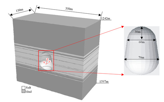 Based on the geological conditions of target strata and previous research results [37,38,39], a pear-shaped cavity was used to construct the salt cavern gas storage in Sanshui Basin. The morphological structure of the salt cavity had a height of 30 m at the top, a diameter of 60 m in the upper hemisphere and 70 m in the lower hemisphere. The whole height of the cavern was 95 m. There were 10 mudstone interlayers distributed in the target salt formation. The corresponding geological model is shown in Figure 14. The hexahedral mesh was used in the model and the sensitivity analysis of its mesh density was done. The model was meshed with a total number of 244,044 elements and 52,112 nodes.
