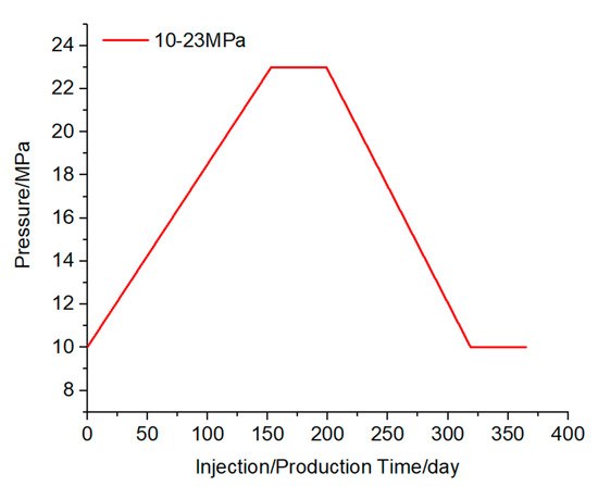 According to the depth of the last casing and domestic and foreign experience, the upper limit pressure of the designed and constructed salt cavern gas storage was 23 MPa, and the minimum internal pressure is 10 MPa. The injection-production operation simulation is carried out with a service life of 30 years. One cycle consists of four stages of gas injection, well shut in, gas production and well shut in, as shown in Figure 15.