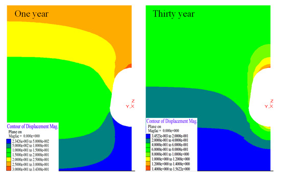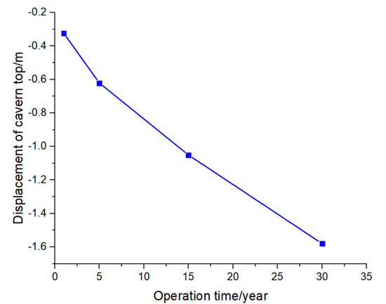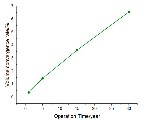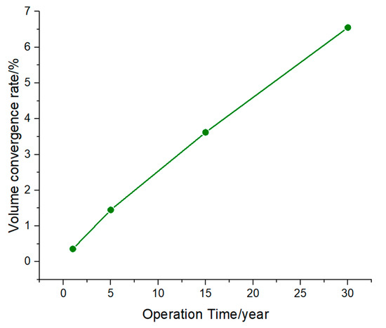 According to Wang’s research [40], the displacement of the cavity top should not exceed 5% of the maximum diameter of the salt cavity. After 30 years of operation, the cavity top settlement displacement is about 1.57 m (as shown in Figure 18), which is 2.2% of the largest diameter (70 m) of the cavity, indicating that the stability of the cavity is good under the operating pressure. Figure 19 shows the volume convergence of the chamber under different operation times. After 30 years of operation, the volume convergence rate of the cavity is 6.55%, which meets the stability requirement that the volume convergence rate should not exceed 5% during 5 years of operation. Similarly, it reflects the good stability characteristics of the cavity.