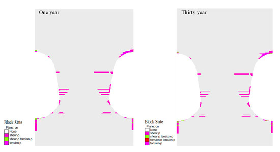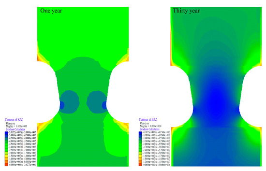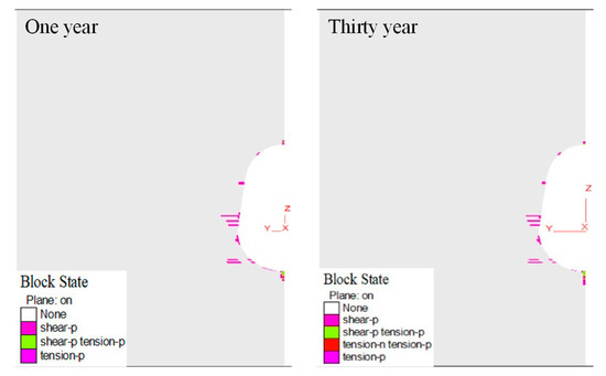 Figure 21 and Figure 22 show the vertical stress and plastic zone of surrounding rock in the first year and the thirtieth year after gas production. The stress distribution is basically symmetrical along the vertical centerline of the pillar. In the first year, the stress at the top and bottom of the cavity is relatively small, while the stress at the minimum spacing is relatively large. The plastic zone is distributed asymmetrically. The plastic zone of the surrounding rock of the roof of the right cavity is significantly larger than that of the surrounding rock of the left cavity. The plastic zone is mainly concentrated in each interlayer, the cavity top and bottom. The failure mode is mainly shear failure, and the plastic zone of the pillar is not connected. The extreme value of vertical stress decreases in the thirtieth year. The distribution of plastic zone is similar to that of the first year, and the volume of plastic zone changes slightly. During the overall operation, the convergence rate of two cavities meets the requirement that the convergence rate is less than 10% in ten years [42], shown in Figure 23, and the pillar design is reasonable.
