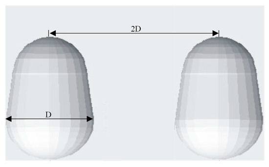 For the construction of salt cavern storage cavern group, the minimum safety distance of adjacent caverns should be considered. The layout of the multi cavern is recommended to be in a positive triangle layout, and the pillar design of each adjacent cavern should be equal [41]. Therefore, the problem can be simplified to only analyze two adjacent caverns. Figure 20 shows the design width of adjacent storage pillars, where D is the maximum diameter of any cavity. The designed well spacing of Sanshui Basin is 250 m, and the pillar width is 2.14D, so the pillar width is considered as a 2D working condition. The maximum operating pressure for the numerical simulation of injection-production operation of tunnel group is 23 MPa, the minimum is 10 MPa, and the operating time is 30 years.