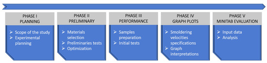 The tests were performed, varying the selected factors according to the values specified. After running the tests and calculating smoldering velocity in each case, all data were inserted in Minitab to continue with the DOE analysis. Afterward, it was possible to produce some graphs in this software to analyze the influencing factors and smoldering velocity.