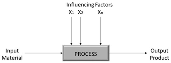 The objective of the experimental design is to perform a sequence of tests with some changes in the input variables of a process, which allows one to observe and identify corresponding changes in the output response. The core of this work was developed based on DoE defined by Minitab. As shown in Figure 3, its procedure is envisioned as a combination of influencing factors affecting a process and transforming an input material into an output product.