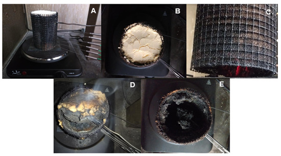 Many specific behaviors of propagation development were noticed during the experiment, similar to those observed by other authors [19,22]. Figure 4 depicts a sequence of images taken during the test development of the corn flour sample. First, the fuel material was gently packed into the cylindrical reactor, avoiding the mass compaction located on the hot plate, and the thermocouples were connected to it (A). After the heating onset, some displacement, a contraction at the bottom and cracks on the top, indicated the drying step progress and the shrinkage of the material (B). Once the plate heating started, the heat generated by the plate began to heat the first layer by conduction, then the following layers were heated by the previous layers as the reaction front moved upwards. The occurrence of three basic steps can explain the smoldering process: pre-heating and drying of corn material, pyrolysis reaction transforming the fuel into char, and char oxidation reaction releasing more heat to the sample material. After 4 h, the electrical panel was turned off, and the heating source was interrupted. If the heat generated by the oxidation step is sufficient, the heat propagation continues, and the upward smoldering process remains active. However, the smoldering process ceases if the heat released is not higher than the heat absorbed by the heating and pyrolysis steps. As illustrated in some works [17], the appearance of a glowing mass may occur during the smoldering process, which was also observed during some experiments (C), especially experiments with dry corn flour. Additionally, the presence of smoke (D) was observed during the whole process. After the burning process, part of the material turned to ashes and char residue (E) or if the burning was incomplete, unburnt material.