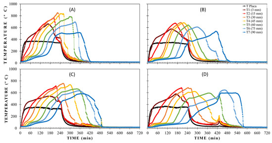 As previously mentioned, seven thermocouples measured the evolution of the temperatures inside the corn bed. For each case, a graph was plotted indicating the temperature variation along the central axis of the reactor. As the heating, pyrolysis, and oxidation steps progressed, the heat was propagated toward the top of the sample, and temperatures at different heights of the corn bed were recorded. Subsequently, the graphs exhibited this temporal variation of the seven thermocouples within the sample and some differences and patterns could be observed.