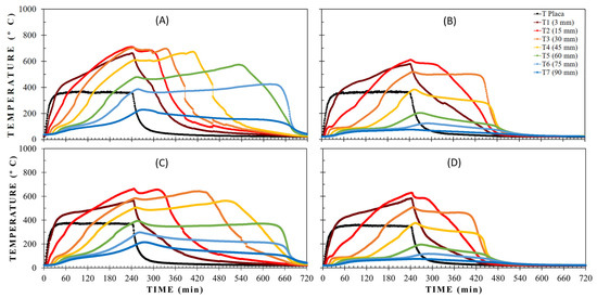 Figure 5 displays four graphs showing the temporal evolutions registered in the tests with corn flour; each graph varied the moisture content and the ventilation condition. Figure 5A,B show the temporal evolutions of the temperature of the thermocouples obtained in an experiment with dried (CF-Dried) and wet corn flour (CF-Wet), while Figure 5C,D show the experiment with the air ventilation system for dried (CF-Dried-V) and wet corn flour (CF-Wet-V).