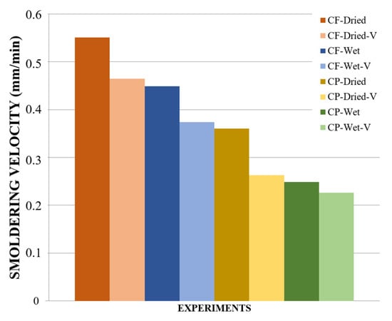 Comparisons of the smoldering velocities acquired varying the three factors adopted to evaluate the process show that the smaller the particle size, the greater the smoldering velocity, as depicted in Figure 7. The corn flour propagation rates for dried and wet cases are 0.55 and 0.45 mm/min. In the meantime, the velocities of the corn powder samples achieve 0.36 and 0.25 mm/min, respectively. A comparison between the two-particle size samples with the same moisture content shows a variation of 35% for the dried samples and 45% for the wet samples. When comparing the influence of moisture, a variation of 19% for corn flour and 31% for corn powder is observed, indicating a more significant impact of this factor in corn powder samples. The air ventilation reduces the velocities of all samples. The corn flour samples, CF-Dried-V and CF-Wet-V, show velocity values of 0.47 and 0.37 mm/min, and the corn powder samples, CP-Dried-V and CP-Wet-V, registered 0.26 and 0.23 mm/min. This ventilation leads to 15% and 17% variations for dry and wet corn flour, and 27% and 10% for dry and wet corn powder. Although adding an airstream can provide more oxygen and thus promote a more intense combustion scenario, the tested cases indicate the opposite showing a slower propagation velocity.