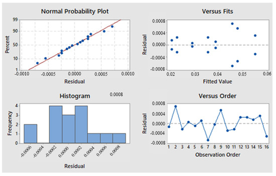 The normal probability plot of these residuals is one of the four graphs presented in Figure 8. Most of the points in this plot fit precisely along the straight line, even though some do not fall precisely above the line, which indicates minor problems with the normality assumption. Still, no severe abnormality in the data set is suspected. Therefore, the data can be considered satisfactory for the analysis. Another graph related to residual plots is the histogram that shows a distribution similar to a Gaussian curve. This graph allows us to conclude that the number of tests reproduced is sufficient to guarantee that a normal distribution can represent the smoldering process. Finally, the last two graphs of residuals versus fitted values and residuals versus the observation order do not reveal any unusual or diagnostic pattern.