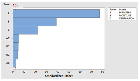 Figure 9 shows the Pareto Chart of the standardized effects that evaluate the effects of each influencing factor on smoldering velocity, which compares the relative magnitude and the statistical significance of both main and interaction effects. The standardized effect compares the t-statistic from each factor to the value corresponding to the error. This graph defines the particle diameter as factor A, the moisture content as factor B, and the air ventilation system as factor C. This graph evaluates the effects of each factor alone and the effects of more than one factor acting on the process. The factor with the most significant influence on smoldering propagation is the particle diameter, followed by the moisture content of the material. It is worth emphasizing that the impact of the material size is almost twice more significant than the influence of the moisture content. Additionally, according to the Pareto Chart, the effect of two or more factors together is not so relevant. This fact can also be verified in the set of interaction plots for the smoldering velocity (Figure 10). No factor presents an interaction between them.