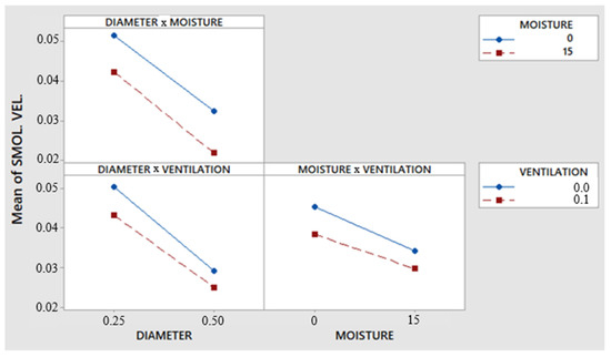 Figure 10 presents a set of three graphs with interactions between two factors (particle diameter versus moisture content, particle diameter versus air ventilation, and moisture content versus air ventilation). There is an absence of interactions between the factors that can be observed in the three plots. As shown in the temporal evolution of temperatures graphs, this factor interaction graph indicates that small particle diameters, low moisture content, and low air ventilation provided higher smoldering propagation velocities. Additionally, it can be observed that when the particle diameter or the moisture of the material achieves higher values, the two levels of ventilation system values tend to come closer and have closer smoldering velocities.