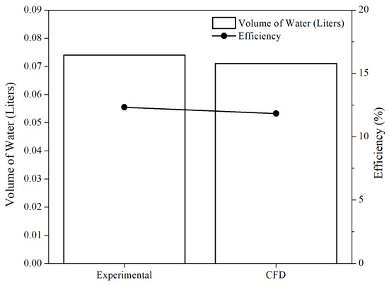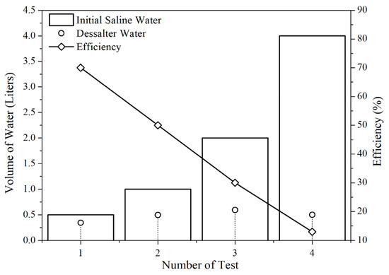 Figure 5 shows the results obtained for the desalinated water production and efficiency. It can be seen that the highest efficiency in the model occurs in the first test, where there is a low volume of water in the prototype, and then the efficiency decreases as the volume increases in the later tests. Physically, it is possible to understand this effect as a consequence of the increase in the height of the water inside the prototype, because with this increase, there is more volume and, consequently, more energy is needed to heat the fluid and start the evaporation process. This effect was also observed by Rajaseenivasan et al., who observed a 20% decrease in water volume with increasing blade height [