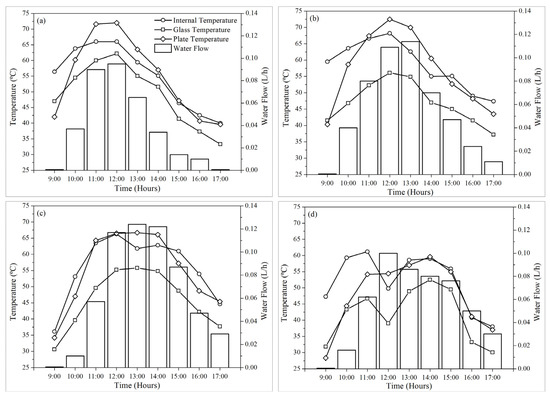 Figure 7d illustrates the behavior of the temperature and flow rate for Test 4. The hours of highest water production for this day were from 12:00 to 14:00. From the results shown in