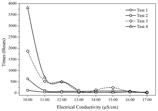 Figure 8, it is possible to verify that the results obtained for all tests demonstrate excellent quality because most data are below 400 μS/cm and only a few values are slightly above, in the range of 500–700 μS/cm.