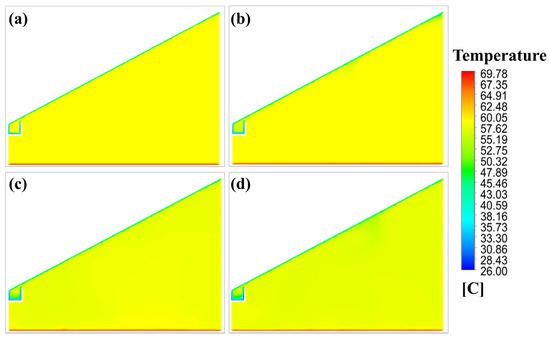 Figure 7a–d demonstrates the behavior of the desalinated water flow rate and the behavior of the internal temperature, glass, and plate for the tests performed. In these figures, it is interesting to analyze the effect of temperature on desalinated water production. Naturally, when temperatures are higher, especially the plate and internal temperatures, water production tends to be higher because the entropy of the process is increased, and, therefore, more evaporation occurs in the system. For condensation to occur, the glass temperature must always be below the plate temperature.