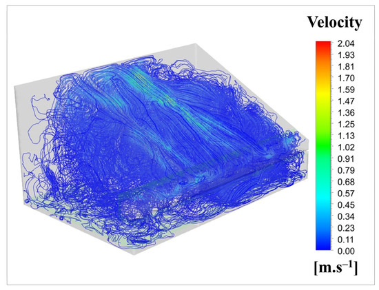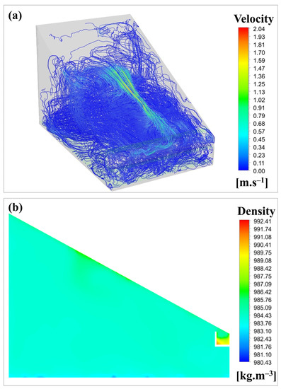 Figure 12a shows the behavior of the fluid mixing velocity for 1 h when employing streamlines. It can be observed from this figure that there are zones of recirculation and vorticity in the flow. While there are zones of higher velocities in the upper part, a zone of low velocity occurs in the middle part, and the flow shows a tendency to flow into the gutter. El-Sebaey et al. also observed this phenomenon and characterized it as a consequence of the influence of air recirculation in driving the condensed volume toward the flume [