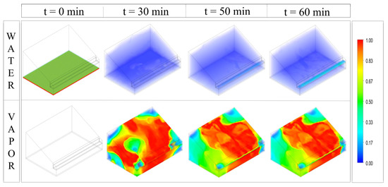 Figure 14 shows a justification for the better performance of this model because as the spacing of the glass between the bottom wall and the front wall of the trough has been reduced, a higher volume of water should condense. This is because the glass in this format generates a larger area of direct contact with the vapor in the initial minutes, considering that in the previous model, the position of the glass had a lower horizontal length. In addition, the gutter has a greater horizontal length in this model, which may improve water capture. Similar to the vapor volume fraction in the previous case, in this model, the vapor behavior also occurs in a way that fills the entire domain.