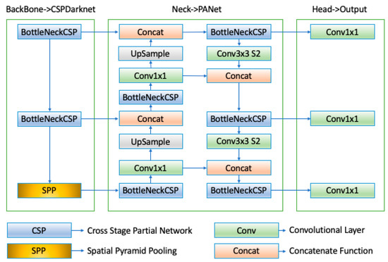 The head of YOLOv5 is responsible for object detection. It consists of 1x1 convolutions that predict the class of an object, with bounding boxes around the target object and a class probability score. Figure 1 shows the overall architecture of YOLOv5.