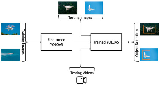 In the past, various techniques, such as radar, were used to detect drones [15]. However, it is very difficult for radar to do so, due to the low levels of electromagnetic signals that drones transmit [16]. Similarly, other techniques, such as acoustic and radio frequency-based drone detection, are costly and inaccurate [17]. Recently, machine learning-based drone detectors, such as SVM and artificial neural network classifiers, have been used to detect drones, achieving better success than radar and acoustic drone detection systems [18]. The YOLO algorithm has outperformed competitor algorithms, such as the R-CNN and SSD algorithms, due to its complex feature-learning capability with fast detection [18]. In fact, the YOLO algorithm is now instrumental in object detection tasks [19]. Many computer vision tasks use YOLO due to its faster detection with high accuracy, which makes the algorithm feasible for real-time implementation [20]. One of the latest developments, YOLOv5, has greatly improved the algorithm’s performance, offering a 90% improvement over YOLOv4 [21]. In the present research, we used YOLOv5 to build an automated drone detection system and compared the results against our previous system with the YOLOv4.