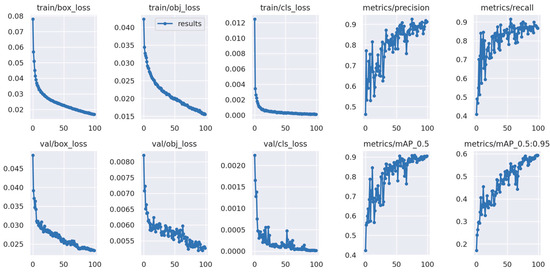 The loss function of YOLOv5 is the combination of loss functions for the bounding box, classification, and confidence. Equation (2) represents the overall loss function of YOLOv5 [32]: