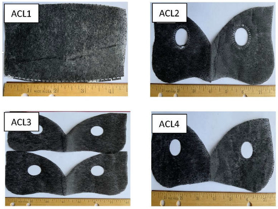 The porosity of samples was not observed in this study, likely due to the samples’ low surface area, which made them difficult to detect. Additionally, the ACL was not purely made of carbon; the carbon layers were covered or sprayed with other materials, as seen in the images. This may have further contributed to the low surface areas and, thus, the lack of observation of porosity.