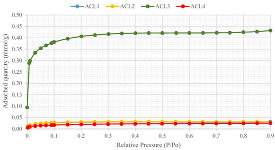 The rapid rise of N2 adsorption over a low range of relative pressure verifies the presence of microspores for all the samples, as illustrated in Figure 3. It is apparent that ACL4 has the lowest N2 adsorption, whereas the adsorption isotherms of ACL1 and ACL2 overlap and ACL3 has the highest N2 adsorption. This variability in data may be attributed to the different precursor materials used. Moreover, except for ACL3, most of the pore volumes of the ACLs are filled below P/Po ≈ 0.1. The pore volumes are filled below P/Po ≈ 0.3 for ACL3. After an initial increase to 0.1, the isotherms gradually bend, indicating smaller increments in further adsorption. As the relative pressure increases, the adsorption of all samples becomes almost horizontal, which indicates that saturation has been reached.