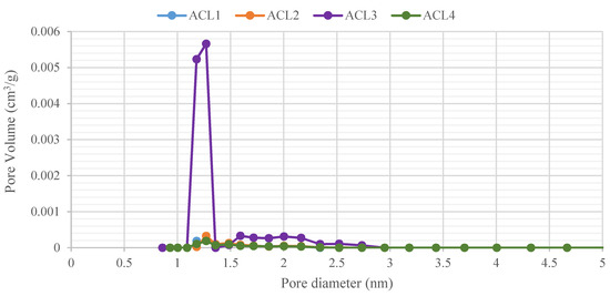 The pore size distribution is another important parameter since it affects the AC adsorption capacity [45]. Thus, analyzing the entire pore size distribution of the adsorbent is essential. It can also be used to characterize the structural heterogeneity of porous materials [46]. The DFT method is often used to investigate the pore size distribution. As shown in Figure 4, the pore size of all the ACLs is not uniform and is less than 3 nm. Their pore size distributions overlap for ACL1, ACL2, and ACL3, with most of the micropores having a diameter of around 1.3 nm. ACL3 has the highest volume of micropores and mesopores and a second, smaller peak between 1.6 and 2.2 nm, indicating an increasing volume of micropores as the surface area increases.
