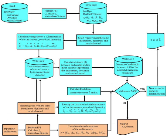 The general procedure is summarized in Figure 1. First, the fundamental frequencies and their corresponding timbral coefficients were obtained for each of the 240 sounds analyzed from the 2 databases, namely, List 1, in Figure 1. With this data, a general dataframe was built. After the mean value of the timbral coefficients was listed, the data was grouped by instrument, note, and dynamics for List 2. The mean of the standardized data was calculated (namely, list 2), grouping the data by instrument, note, and dynamics. Subsequently, the Euclidean distance for each sound was calculated considering the data in List 3, which was grouped by musical sound and the dynamics of the instrument, specifically, by Flute and Clarinet, 12 sounds of the fourth octave, and 3 dynamics (p, mf, f) for a total of 72 types of audio in 244 records of the data set. When the test audio was incorporated, the software obtained the timbral vector “b” of that audio and identified it using List 2. The characteristic value of the vector “a” corresponds to the said instrument, sound, and dynamics. We proceeded to calculate the Euclidean distance between both (d). If, statistically, the distance is probably significant (less than 2.4 times SD), the audio test was considered as corresponding to the sound, instrument, and dynamics of List 3, in the ith position. Finally, the new audio was incorporated into the database. Otherwise, the software indicated the Euclidean distance, such as the similarity weighting and the timbre characteristics associated with the said audio.