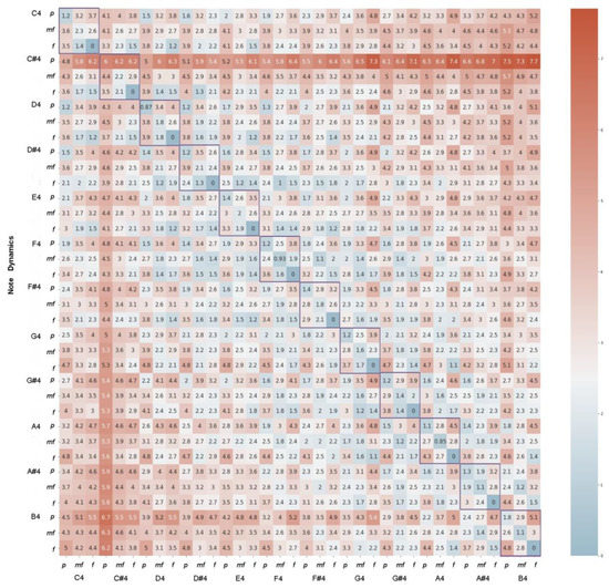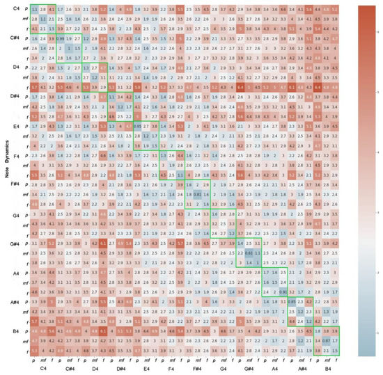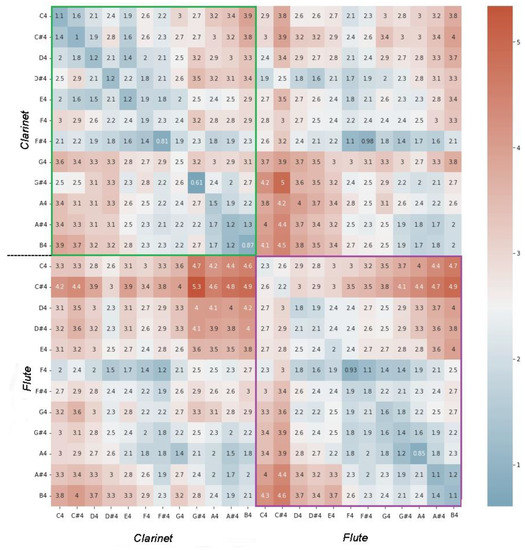 Following the previous procedure, for the Clarinet and Flute reference audios of the 4th octave and a dynamics of mezzo-forte for both databases, we obtained the average distances in the seven-dimensional timbral space between the positions of each sound with respect to all of the others (Figure 2). It was observed that the minimum distance occurs precisely for the correspondence between the sounds (diagonal elements), and in all cases, it is statistically discernible for a normal distribution (less than 2.4 times the standard deviation). In addition, the distance of any sound of the Clarinet with respect to those of the Flute, and reciprocally any of the sounds of the Flute with respect to those of the Clarinet (matrix sub-blocks without color), is greater than those corresponding to the distance between sounds of the same instrument (matrix sub-blocks in color green and violet).