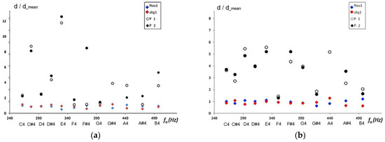 Patterned distance between musical sounds in mezzo—forte for the 4 ta octave, reference sounds in the dataset: (a) Clarinet (b) Flute.