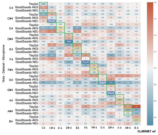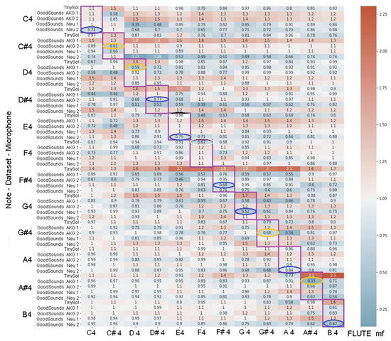 The diagonal sub-blocks of the matrix indicate the correspondence with the expected values for the ratio between d/d_mean. The minimum value in each data set has been highlighted. For the Clarinet, the GoodSounds Neumann audio recordings are closer to the mean value and better discriminate the smallest distance in relation to the other distances of the other sounds (minimum value for each row, highlighted in dotted ovals). Figure 6 shows the comparison of the Transverse Flute data sets. The GoodSounds database provides two sets of Neumann-type and AKG-type records.