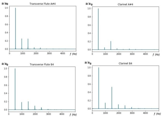 For this study, only monophonic sounds were analyzed using the FFT of the audio records for the two common woodwind instruments in the databases Tinysol and Good-Sounds: the Transverse Flute and the Clarinet. The analysis presented includes only the fourth octave of the equal temperament scale. These are the most typical types of musical scales in Western music culture and are also the ones used by the audio recordings of the datasets used in this work. We used the following nomenclature for each sound of that octave: C4, C#4, D4, D#4, E4, F4, F#4, G4, G#4, A4, A#4, and B4. From the Good-Sounds database, only single-note sound recordings labeled “Good-Sounds” were used, and records in the database were called “AKG” and “Neumann” in all of the dynamics differences (p, mf, f).