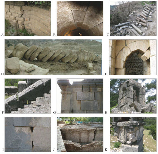 Examples of deformations and damage which are possibly earthquake effects: (A) the horizontally deformed wall of a crusader fortress built on top of the Dead Sea Transform Fault in the Jordan Valley; (B) the deformed vault of a Roman sewer in Cologne, Germany; (C) toppled columns of a Byzantine church in Sussita located above the Sea of Galilee; (D) toppled column of the great palace in Petra, Jordan; (E) moved block in an arch of the Nimrod fortress in the Golan Heights; (F) shifted blocks of an analemma of a Roman theatre in Pınara, SW Turkey; (G) moved blocks of a corner wall of a Roman monument in Patara, SW Turkey; (H) shifted blocks of a Roman grave house in Pınara, SW Turkey; (I) spall of block corners, same object as in (G); (J) broken and horizontally displaced fortification wall of the Roman Tolbiacum (Zülpich, Germany); (K) rotated Lycian sarcophagus in Pınara, SW Turkey. (Photos courtesy of K.G. Hinzen).