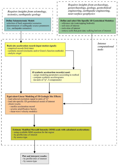 Figure 4 illustrates the proposed conceptualized workflow for the forward modeling of 1D seismic site effects in an archaeoseismological project [18]. This workflow is explained as follows. There are three significant elements to this workflow: (1) the contextualization of the seismological models, which must obey the active tectonic scenario proximal to the archaeological site under investigation; (2) the development of multiple site-specific 1D geotechnical models within the archaeological site or complex; and (3) the actual computational tasks that generate synthetic acceleration time-series from hypothetical earthquake scenarios and the 1D LSR analyses of the selected 1D geotechnical site models.