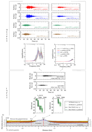 Example of four individual simulations using the Equivalent−Linear model for two 1D site-specific cases from a Late Bronze Age Greek archaeological site (Tiryns): a soil−site (T1s1) and rock-site (T1s3) highlighted by the vertical red bars located along the geologic profile (lower panel). For one simulation, the input consists of one modeling site (e.g., T1s1 or T1s3) represented in two ways: by an average Vs model and a gradient Vs. Each case is accelerated with a synthetic accelerogram calculated with the Stochastic method (SM) and a synthetic accelerogram calculated with Green’s function method (GFM) (middle panel). The synthetic accelerograms correspond to a local strike-slip earthquake (Mw = 7.0) triggered by the nearby Iria−Epidaurus fault segment. The output yields a computed site−specific surface acceleration record and a site−specific seismic amplification function (upper panel). Used with permission from [18]. Copyright 2016, Hinojosa−Prieto, H.R.