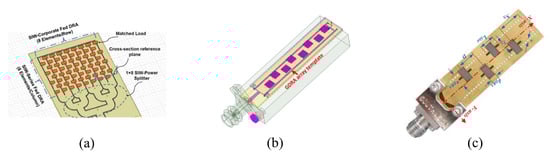 In order to increase the gain, several studies have been conducted using multiple elements to design DRA arrays. Notably, refs. [41,42,43,44] have used an SIW as a feed network. Abdel-Wahab et al. [41] conducted research that would improve the radiation efficiency using N-element linear arrays based on two different feeding slot configurations. Likewise, in another study [45], conducted by the same author of [41], an array of four DRA elements was designed using an SIW feeding network at 33.9 GHz and achieved a gain of 11.70 dBi, a bandwidth of 4.7%, and an efficiency of 90%. Yet the weakness of [41] is that it lacked a matching circuit which could have been used to improve the coupling in the SIW longitudinal slot case. Alternatively, different structures for the SIW were utilized in [42,43]. In [42], an 8 × 8 rectangular 2D DRA array, as illustrated in Figure 5a, has been proposed using an SIW hybrid feeding network. The results of the study demonstrate a gain of 22.6 dBi, bandwidth of 6.1%, and radiation efficiency of 89%. In [43], the study involved the analysis, design, and measurements of an SIW-integrated parasitic DRA array to minimize the metallic loss at the mm-wave band. The resulting gain increased from 11 dBi using four driven DRAs to 13 dBi by adding eight parasitic DRAs. The bandwidth and the efficiency remained the same at 2.5% and 91%, respectively.