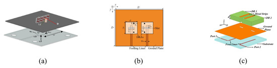 A wideband circularly polarized substrate-integrated dielectric resonator antenna (CP SIDRA) has been reported with the respective gain, impedance, and CP bandwidth of 8.15 dBi, 34.6%, and 26.3% [66]. However, this technique is expensive and sophisticated, with a relatively large size. An experiment has been conducted on a wideband CP 2 × 2 DRA array with a feed that consists of sequential networks and cross-slots [67]. Each unit element is 90 degrees from the adjacent element, and the results demonstrate an impedance and a CP bandwidth of 33.8% and 5%, respectively, with a gain of 9.5 dBi. In [68], the authors proposed a CPDRA that would operate at 24 GHz. Remarkably, their aim was to design a larger DRA, and they achieved that by operating the antenna at a higher mode of . A rectangular DRA and three rectangular slots make up the antenna structure, such that one of the slots is at the center, and the two other slots are equilaterally inclined with regard to the center slot. The results illustrate that when the antenna operated at the higher mode of , the antenna size was increased by 61%. A phase difference was provided by the two stubs and the main microstrip feed that are used to design the modified microstrip. The study achieved an impedance bandwidth of 15.06%, a gain of 7.9 dBi, and an axial ratio of 5.8% [68].