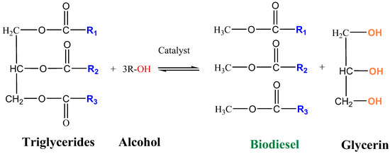 Transesterification is an alcoholysis reaction since fat or oil intervenes with short-chain alcohol to produce esters and glycerol in the presence of a catalyst to accelerate the reaction rate and improve yield [6,7]. This reaction consists of three consecutive and reversible stages, transforming triglycerides into diglycerides, monoglycerides, and glycerin [8]. The process is shown in Figure 1.