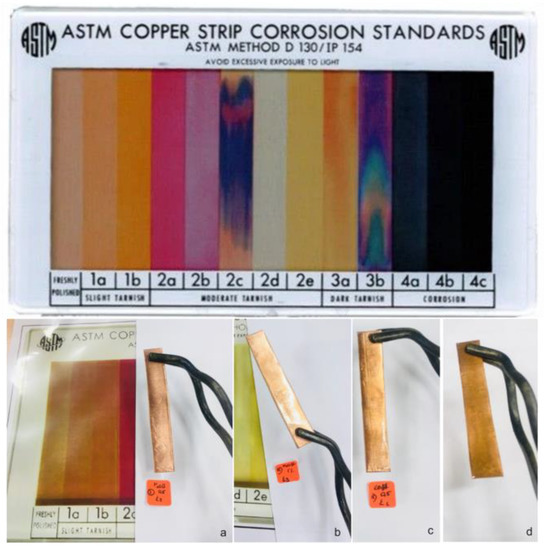 The method used to determine copper corrosion was based on the ASTM D130 [28] standard. The result was obtained by comparing the color of each copper strip with the color scale given by the same standard. In this case, all the samples presented the same value on the scale. Therefore, it was not analyzed statistically. The results are presented visually in Figure 2.