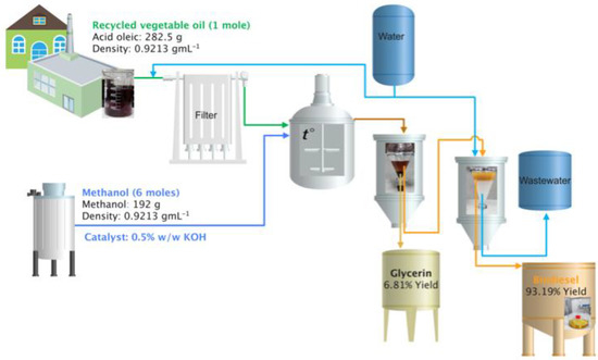 In recent years, the use of waste has gained importance as an energy source, because it is renewable and respects the environmental approach [1]. This is how the alternative of obtaining biodiesel from recycled vegetable oil was born. Using used oil enters a philosophy of integrating waste into the productive and economic cycle [3]. This type of waste has a high content of different fatty acids, making it suitable for being treated in a transesterification process. Due to the massive consumption of oils, it is a residue that is readily available. This is the case in Ecuador, where annually, 9.45 million gallons of used vegetable oil are discarded [4]. In addition, another advantage of using used oil as a raw material is that it provides an alternative to waste that is often disposed of inappropriately due to the lack of options for use. In fact, it is common for used oil to be disposed of in drains, rivers, and on the ground, among others, without prior treatment [5].