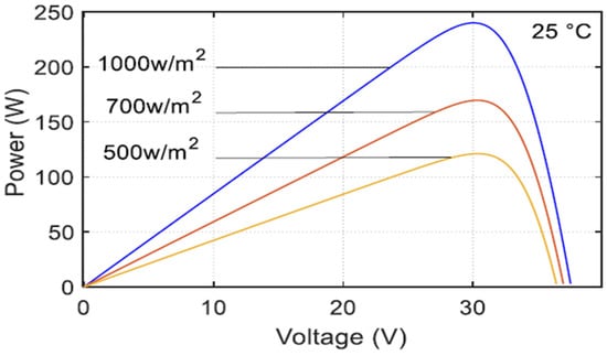 In this study, the authors chose SOLARIA S6M2G240 for reference of the PV module. The P-V curve of the latter under different irradiations is presented in Figure 3.