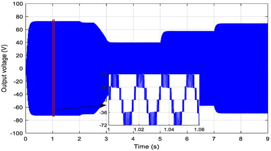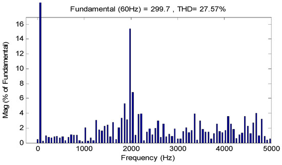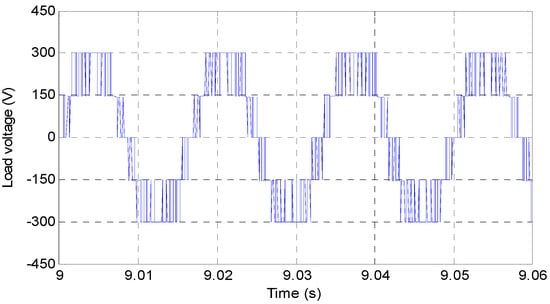 The output voltage is constituted of five levels: 300 V, 150 V, 0 V, −150 V and −300 V as shown in Figure 6. The THD of the load voltage is presented in Figure 7 (around 27.57%).
