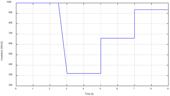 At first [0,2 s], the PV panel is exposed to STC (1000 W/m2 of irradiation and 25 °C of temperature), then the temperature was increased to attain 39 °C with the same irradiation until 2.5 s; thereafter, the irradiation underwent an orthogonal decrease to reach 320 W/m2 at 3 s and remain stable until 5 s; after that, the irradiation suddenly changed to 660 W/m2 from 5 s to 7 s; beyond this period, the simulation continued with a temperature of 32 °C and an irradiation of 935 W/m2.