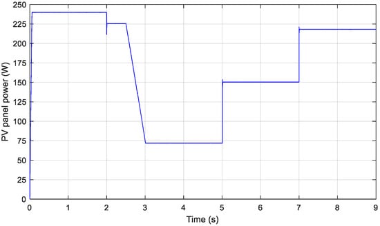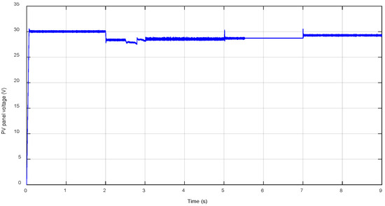 Figure 10 shows the output power of the PV panel using the INC-HYS algorithm; the MPP is reached after a short simulation time; it is approximately 240 W for 1000 W/m2 and 25 °C of temperature, which is in accordance with the characteristics of the PV module presented in the datasheet Figure 3. As the temperature rises, the power decreases proportionally to the irradiation to reach approximately 70 W for 320 W/m2 and 39 °C. In the irradiation of 660 W/m2, the power decreases to quickly attain 150 W; after, in the last change in irradiations and temperature (respectively, 935 W/m2 and 32 °C), the PV panel power increases to 220 W. These remarks validate the effectiveness of the proposed INC-HYS technique to reach the MPP rapidly and accurately even under difficult changing weather conditions. The same occurs for the PV panel voltage, as illustrated in Figure 11, in the time interval of [0,2 s] under STC; the voltage value reaches 30 V after a short time, which is the value corresponding to the maximum power as shown in Figure 3, then the voltage changes and takes the optimal value for each weather condition.