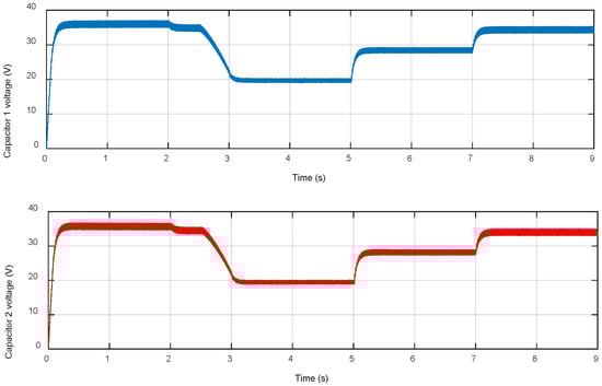 The DC-link voltage is shown in Figure 12. It is well regulated and its values change according to the weather conditions. Figure 13 presents the SPUC5 capacitor voltages. They are properly controlled and maintained at half of the DC-link voltage.