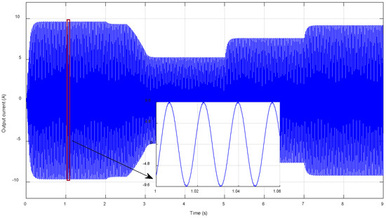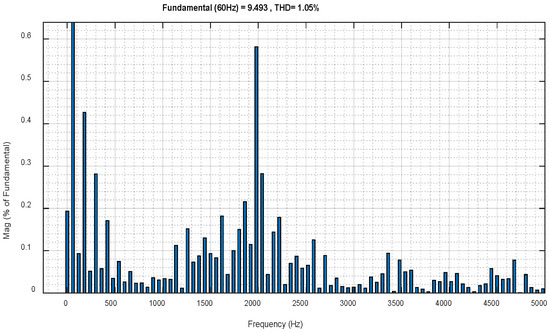 The load voltage is illustrated in Figure 14. The voltage is comprised of five levels. Figure 15 shows the load current; the waveform is quasi-sinusoidal and its THD is approximately 1.05%, as shown in Figure 16, without using any filters, which ensures the efficiency of the used inverter and its controller.