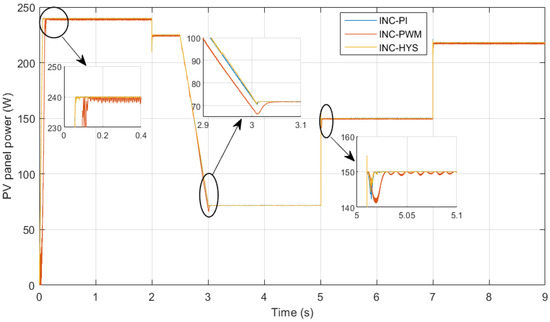 Figure 17 shows the output power of the PV panel for the three commonly used methods. As can be seen, the proposed method is faster than the INC-PI and INC-PWM to detect the MPP even after any irradiation or temperature changes. In addition, the INC-HYS technique is more accurate and has fewer oscillations compared to other methods as it is easy to implement. As a result, the proposed INC-HYS method to control the PV panel power ensures quicker and more efficient responses.