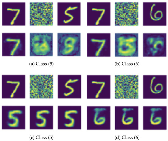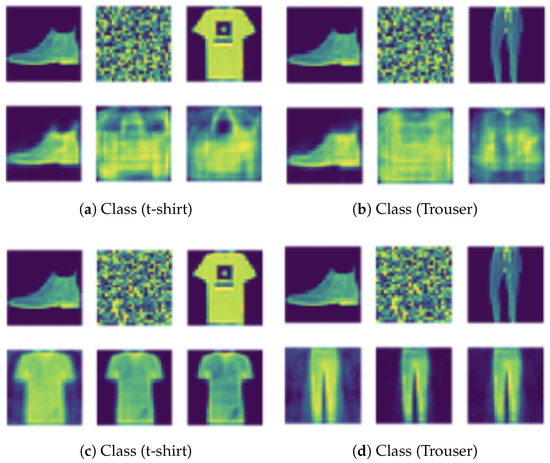 Figure 2 and Figure 3 also show the results of the insertion study, where I forced the pathway of a particular class to be one and zero otherwise and performed the propagation of the forwarding pass (see Figure 2c,d and Figure 3c,d). This study obviously showed that all input images ended up with the reconstruction of the same class of the identified pathway. The insertion study helped to evaluate the effectiveness of my method when revealing the pathway of a given class.