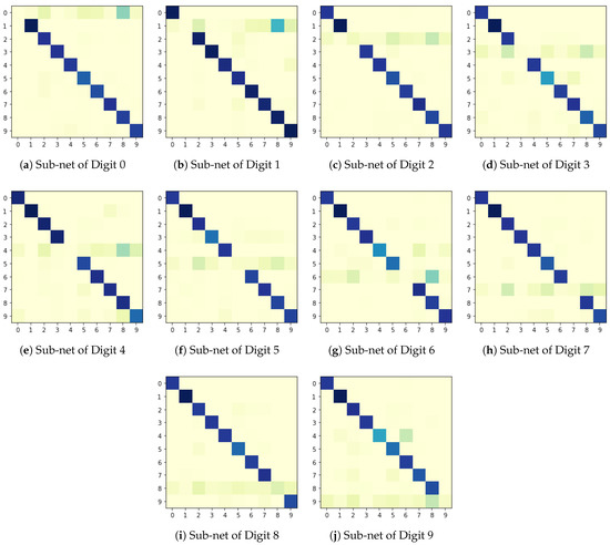 The second model was a classification model, which trained end-to-end in a supervised manner. Figure 4 experimentally analyzes the performance of my proposed method. Using my method, I identified the pathway of each class of trained fully-connected networks. My experiment showed that ablating a specific class pathway has no effect on other classes. One obvious explanation is that the proposed method succeeded in carefully identifying the pathway of each class. It is also crucial to note that because digit 6 has a comparable structure to that of digit 8, especially with regards to the bottom part of both digits (see Figure 4g), the model classified most examples of digit 6 into the class of digit 8. One reasonable justification is that the presented method was able to determine the homogeneous patterns for a particular digit, which leads to the identification of the pathway of the target class.