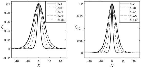 It is well known in the literature that pressure anomalies beneath nonlinear periodic waves are connected to the emergence of stagnation points [,,]. Starting from this point, we first investigated the appearance of stagnation points in terms of the intensity of the vorticity parameter (), then analysed the pressure within the bulk of the fluid. For this purpose, we fixed solitary waves with amplitude , and let the vorticity vary. This choice of F leads to a background flow with zero velocity at the bottom.